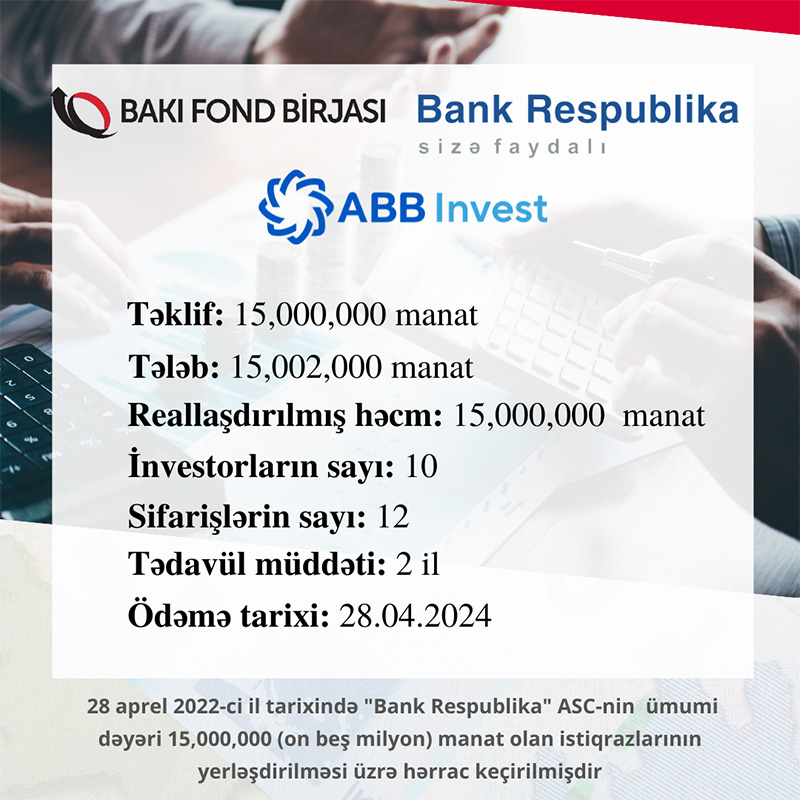 28 aprel 2022-ci il tarixində Bakı Fond Birjasında "Bank Respublika" ASC-nin tədavül müddəti 2 (iki) təqvim ili olan AZ2005002889 dövlət qeydiyyat nömrəli, 15 milyon manat həcmində, faizli, təmin edilməmiş sənədsiz, adlı istiqrazlarının yerləşdirilməsi üzrə hərrac yekunlaşıb.