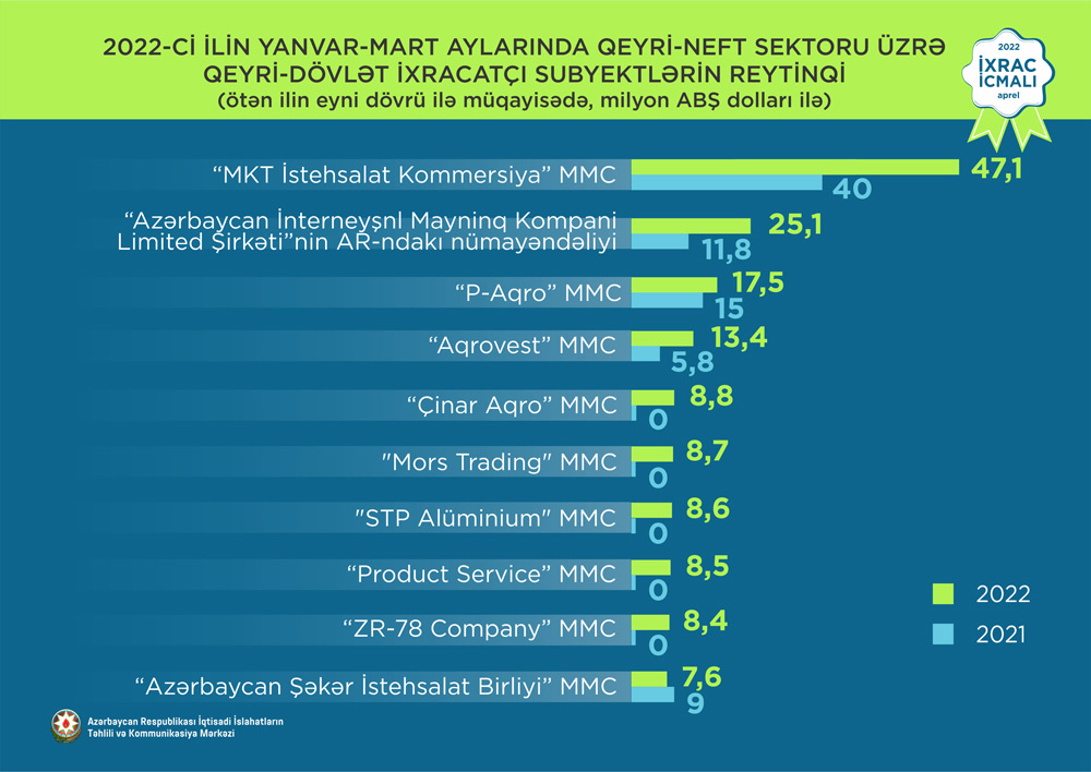 2022-ci ilin yanvar-mart ayları üzrə hazırlanan qeyri-dövlət ixracatçı subyektlərin reytinqində ilk onluqda aşağıdakı şirkətlər təmsil olunurlar: “MKT İstehsalat Kommersiya” MMC, “Azərbaycan İnterneyşnl Mayninq Kompani Limited Şirkəti”nin Azərbaycan Respublikasındakı Nümayəndəliyi, “P-Aqro” MMC, “Aqrovest” MMC, “Çinar Aqro” MMC, “Mors Trading” MMC, “STP Alüminium” MMC, “Product Service” MMC, “ZR-78 Company” MMC, “Azərbaycan Şəkər İstehsalat Birliyi” MMC.