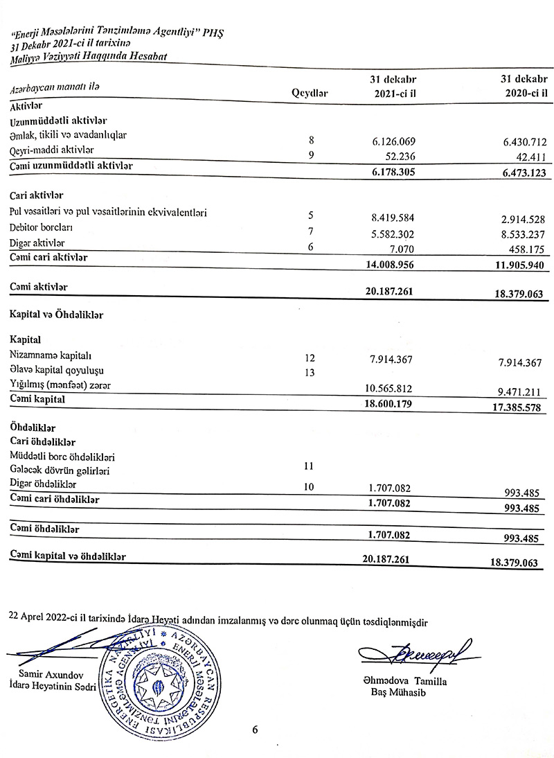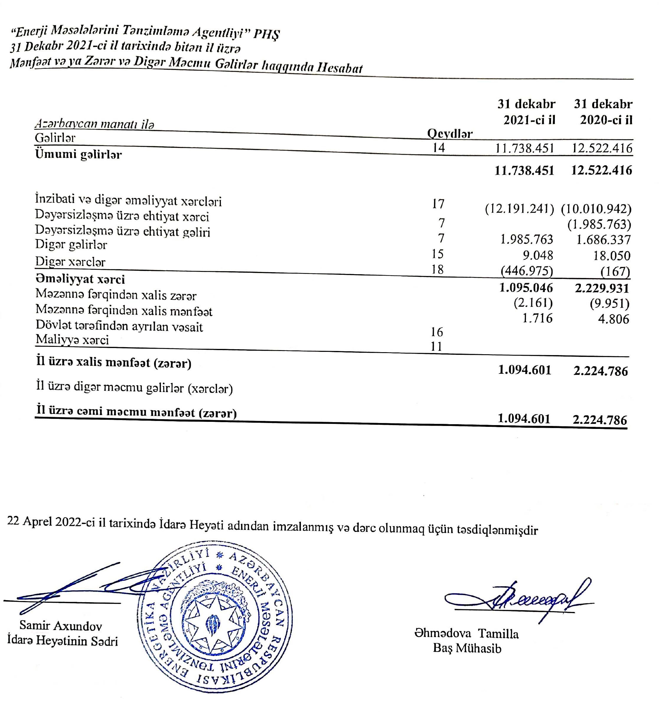 "Enerji Məsələlərini Tənzimləmə Agentliyi" 2021-ci ili 1 milyon 95 min manat xalis mənfəət ilə başa vurub. Halbuki, Agentlik 2020-ci ili 2 milyon 225 min manat xalis mənfəət ilə bağlamışdı.