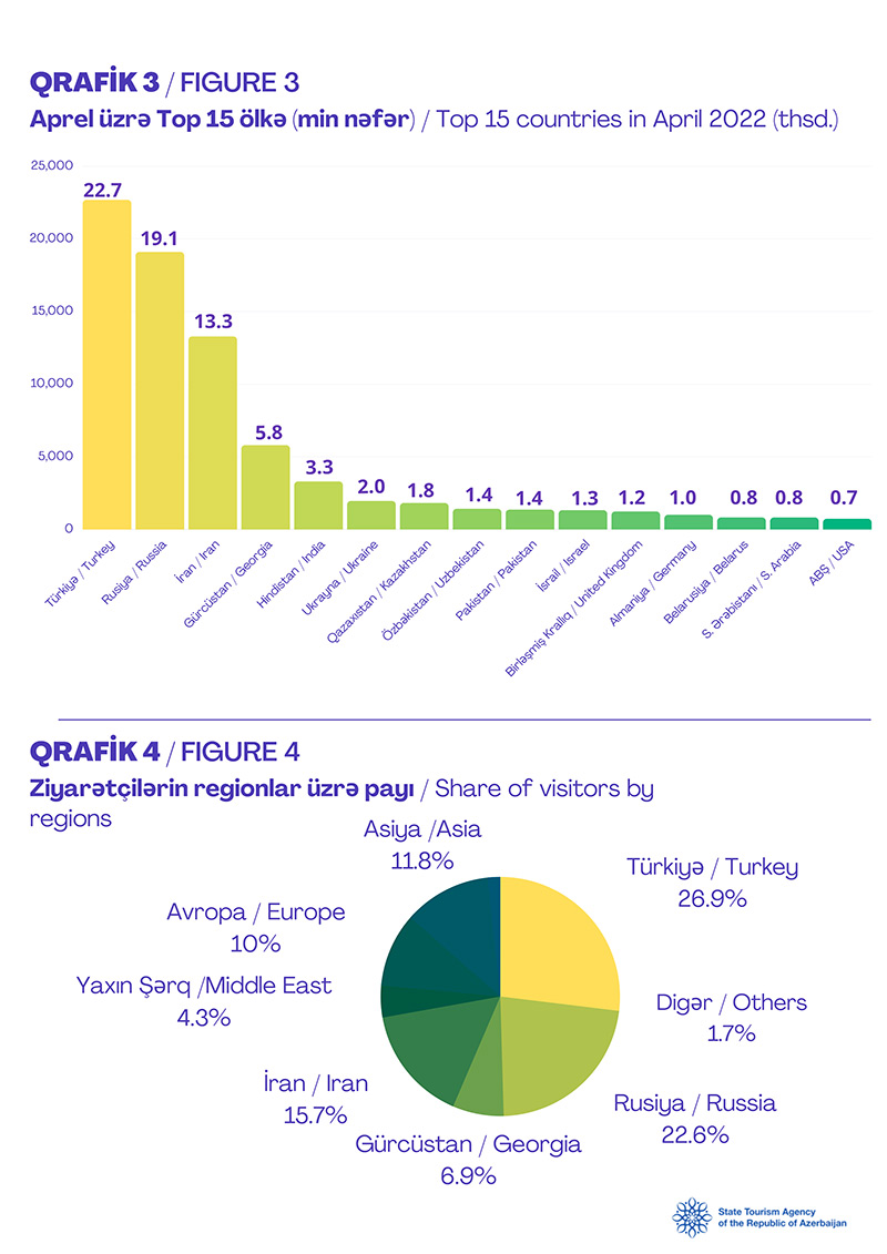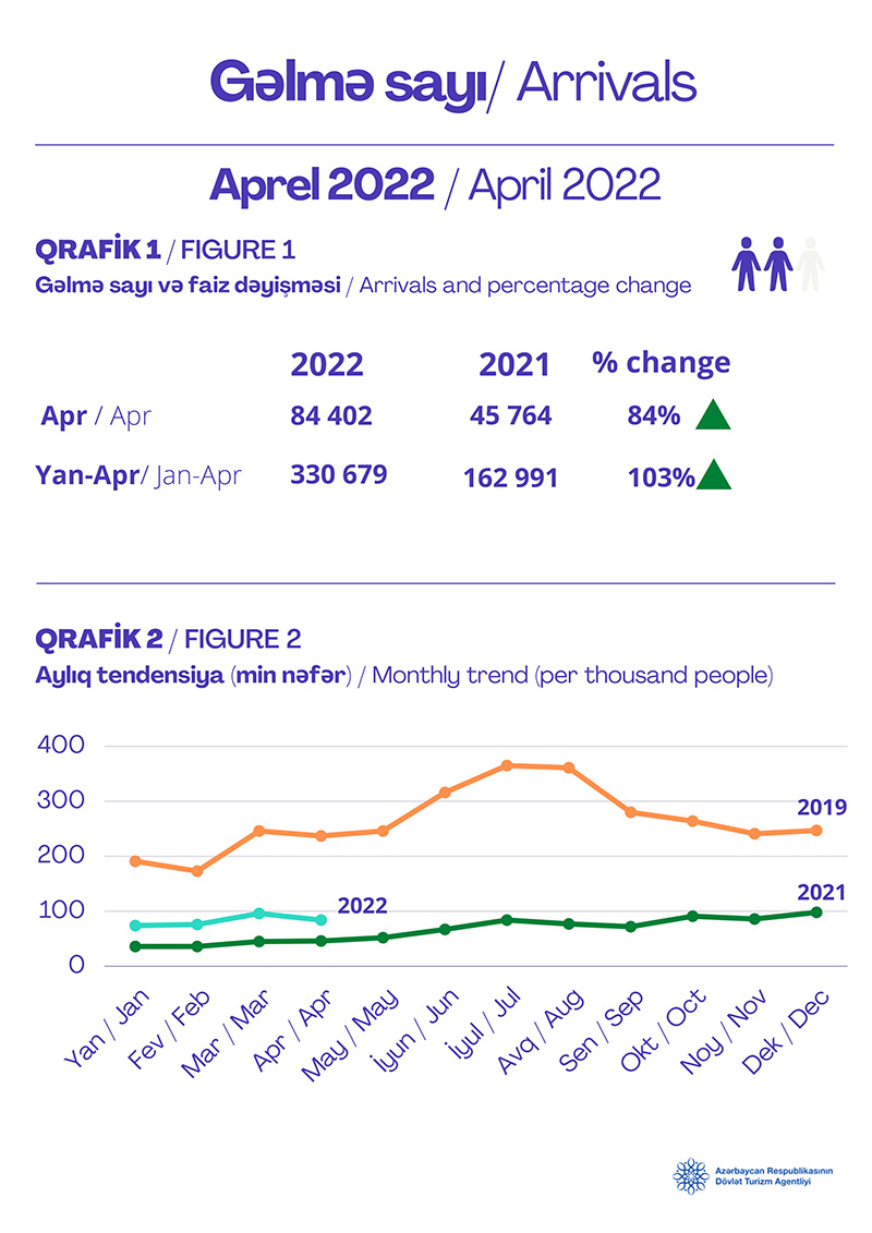 2022-ci ilin ilk 4 ayında Azərbaycana gələnlərin sayı ötən ilin eyni dövrü ilə müqayisədə 103% artaraq 330 min 679 nəfər təşkil edib. 2020-ci ilin yanvar-aprel dövründə Azərbaycana 162 min 991 nəfər səyahət etmişdi.