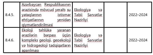 3.13. 8.4.4-cü yarımbəndin “Tədbirin adı” sütununda “Ekoloji təhlükə yaranan ərazilərin bərpası üçün kompleks geoloji, geoekoloji və hidrogeoloji tədqiqatlar” sözləri “Cəbrayıl düzənliyinin (Zəngilan, Cəbrayıl və Füzuli rayonları ərazisi) yeraltı su yataqlarının təftişi və qiymətləndirilməsi işlərinin” sözləri ilə və həmin yarımbəndin “İcra müddəti” sütununda “2020” rəqəmləri “2022” rəqəmləri ilə əvəz edilsin;