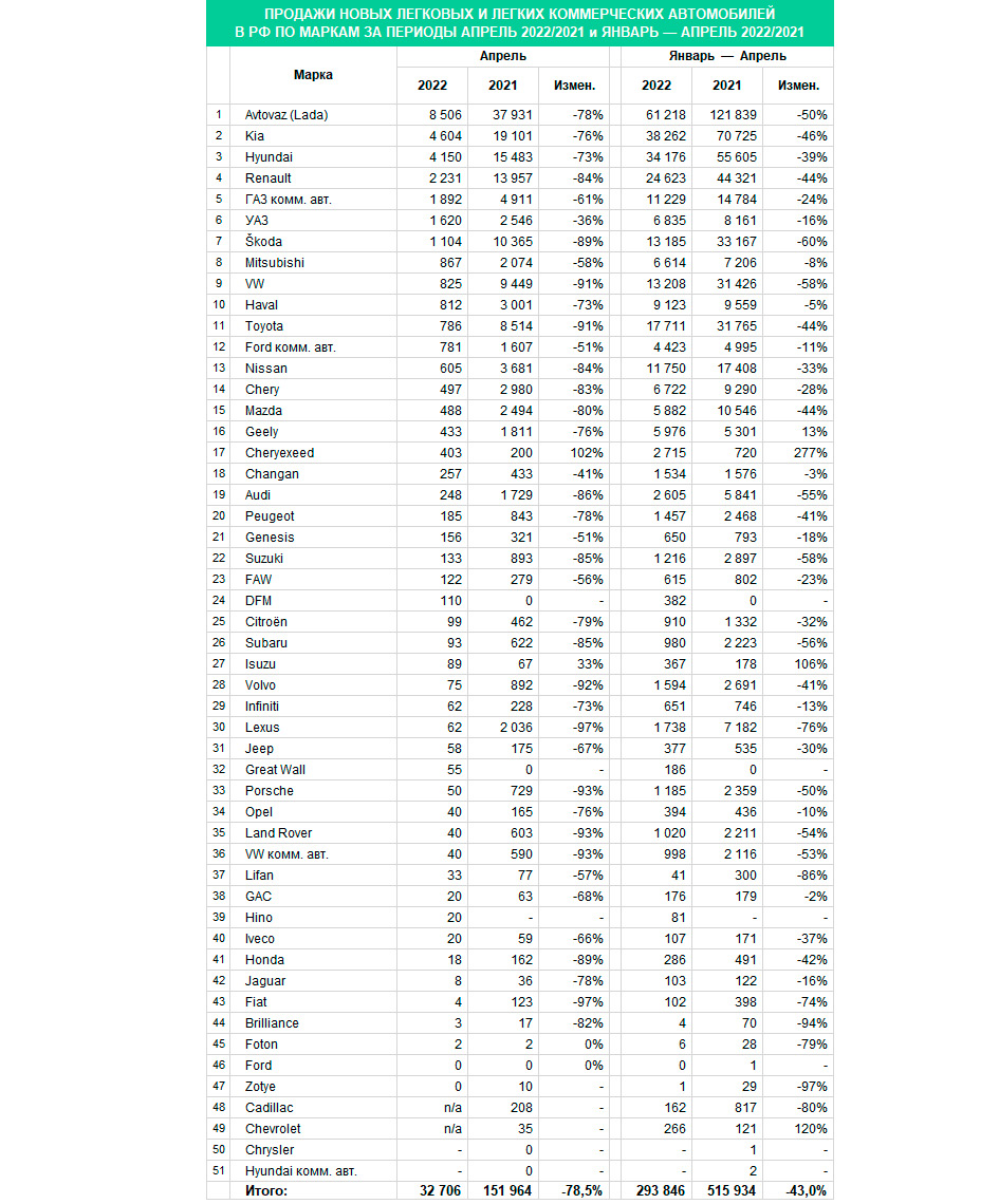 Ümumilikdə, 2022-ci ilin yanvar-aprel aylarında Rusiyada 293 846 yeni minik avtomobili satılıb ki, bu da 2021-ci ilin eyni dövrü ilə müqayisədə 43% azdır.