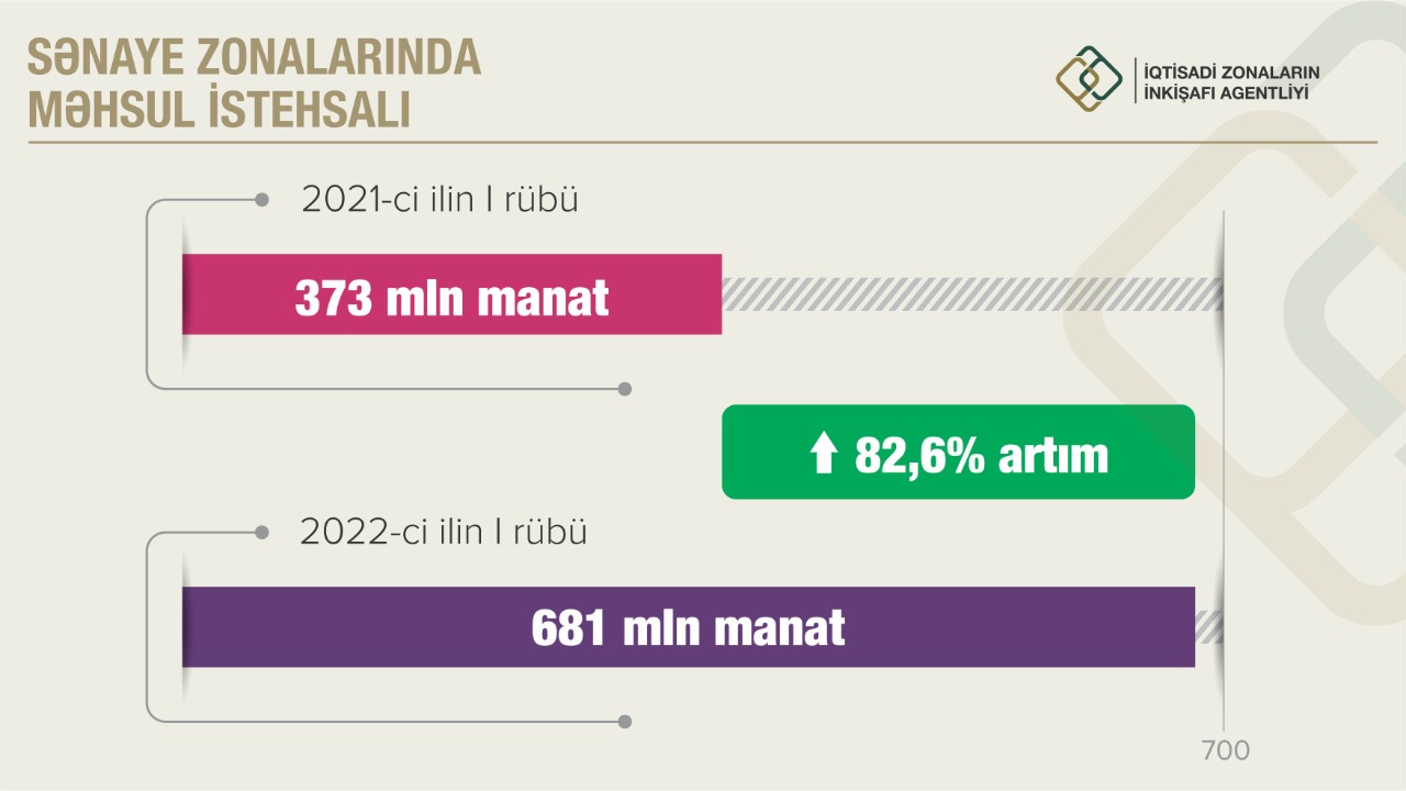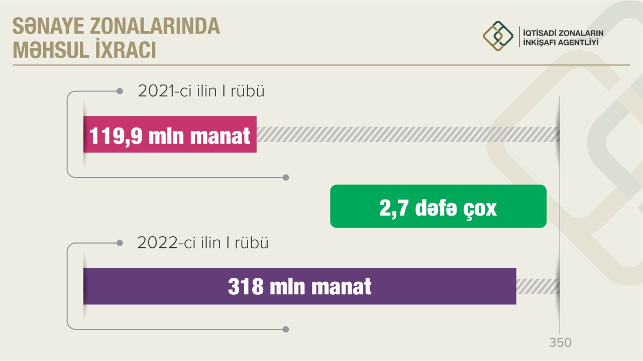Sənaye zonalarında məhsul istehsalı və ixracı istiqamətində müsbət dinamika müşahidə olunur. Statistik göstəricilərə əsasən, 2021-ci ilin I rübündə sənaye zonalarında 373 mln. manatlıq məhsul istehsal edilmişdisə, 2022-ci ilin I rübündə 82,6% (681 mln. manatlıq) məhsul istehsal olunub. İxrac isə 2021-ci ilin analoji dövrü (119,9 mln. manat) ilə müqayisədə təqribən 2,7 dəfə artaraq 318 mln. manat təşkil edib.