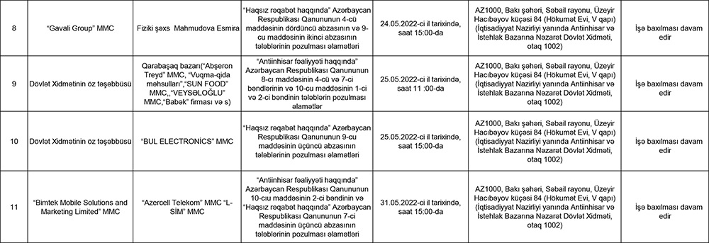 Həmçinin Dövlət Xidməti qarabaşaqbazarında araşdırmalar aparır. “Abşeron Treyd” MMC, “Vuqma-qida məhsulları”, “SUN FOOD” MMC,, “VEYSƏLOĞLU” MMC, “Babək” firması və s. tərəfindən antiinhisar qanunvericiyilinin pozulması əlamətləri aşkar olunaraq həmin təsərrüfat subyektləri barədə iş qaldırılıb.