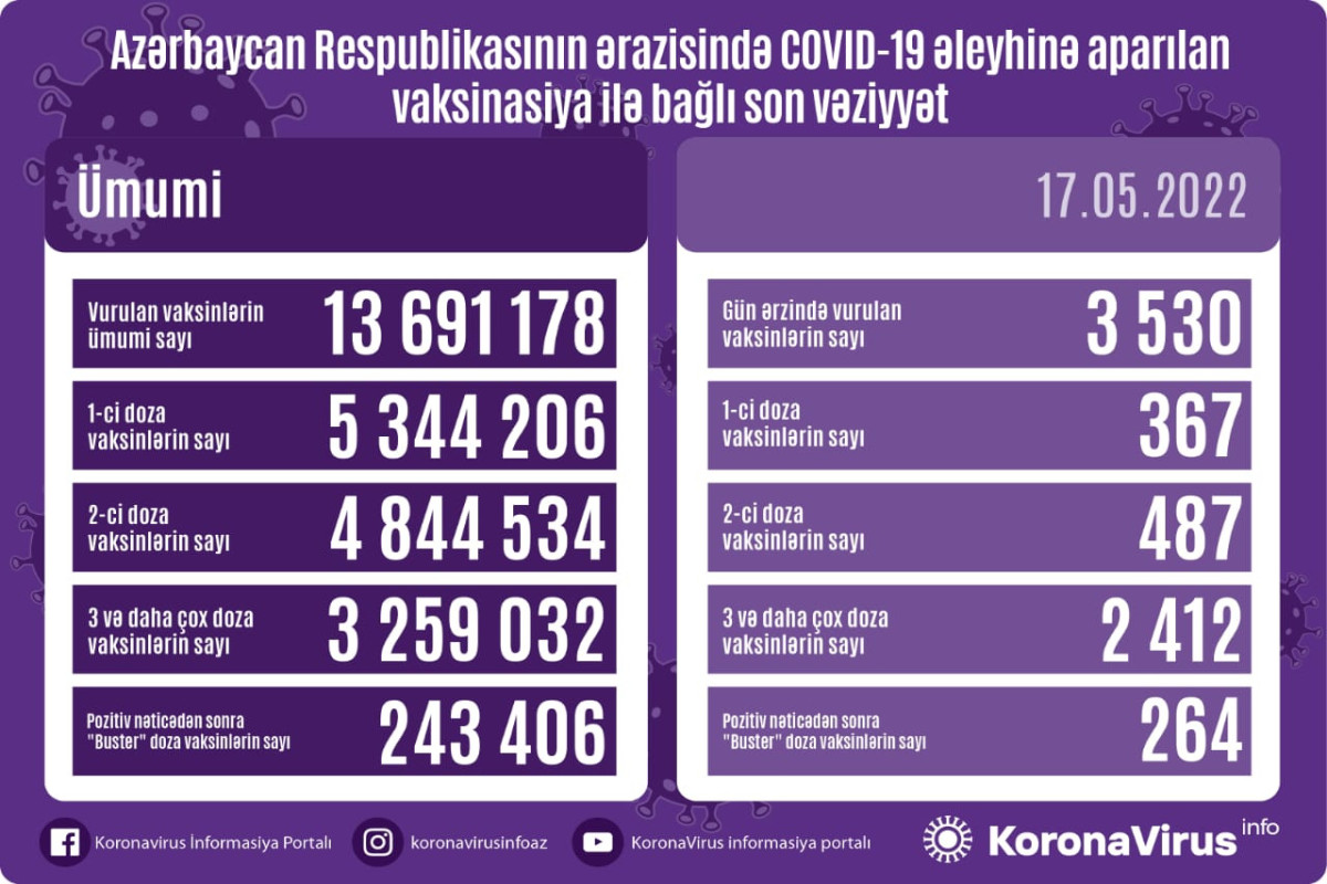 Azərbaycanda son sutkada koronavirus (COVID-19) əleyhinə 3 530 vaksin vurulub. Bir gündə birinci mərhələ üzrə vaksinasiya olunanların sayı 367, ikinci mərhələ üzrə vaksinasiya olunanların sayı 487, üç və daha çox doza vaksin vurduranların sayı 2 412, pozitiv nəticədən sonra buster doza üzrə vaksinasiya olunanların sayı isə 264 nəfərdir.