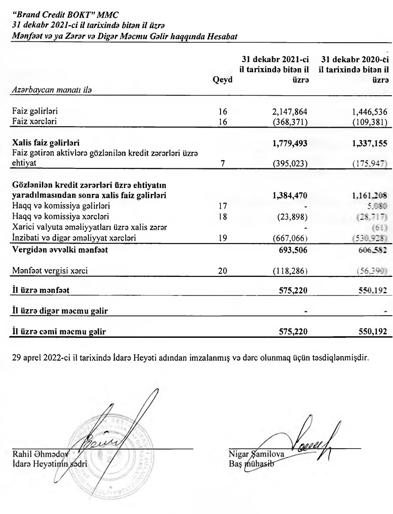 Lombard və avtomobil kreditlərinin verilməsilə məşğul olan "Brand Credit BOKT" MMC 2021-ci ili 575 min 220 manat xalis mənfəət ilə başa vurub. Halbuki, təşkilat 2020-ci ili 550 min 192 manat xalis mənfəət ilə bağlamışdı.