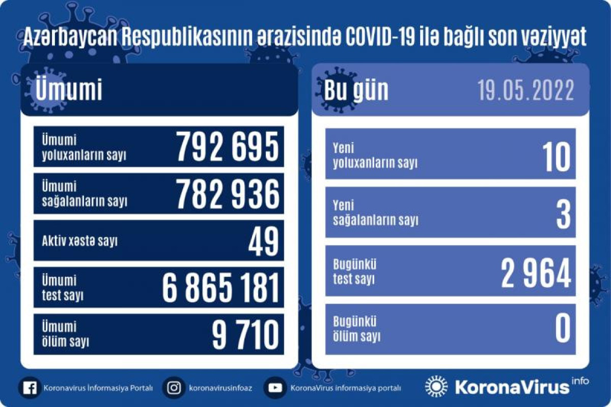 Azərbaycan Respublikasında koronavirus (COVID-19) infeksiyasına 10 yeni yoluxma faktı qeydə alınıb, 3 nəfər müalicə olunaraq sağalıb.