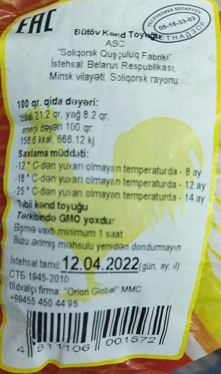 “Orion Global” MMC Azərbaycan Quş Əti, Yumurta İstehsalçıları və İxracatçıları Assosiasiyasının Belarus Respublikasından idxal olunan kənd toyuqları barədə yaydığı məlumatda adı çəkilən üç məhsuldan birinin rəsmi idxalçısı qismində aşağıdakıları bildirir.