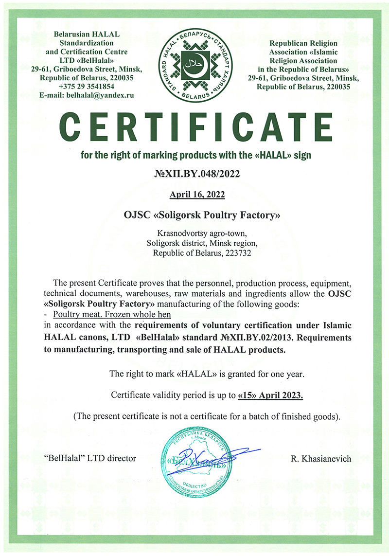 Təkcə onu qeyd etmək yetərli olar ki, sözügedən məhsullar barəsində həm istehsal ölkəsində, həm də ölkəmizdə qida təhlükəsizliyi, keyfiyyət standartlarına uyğunluq sahəsində tətbiq olunan müvafiq nəzarət tədbirləri aparılır. Bundan əlavə, rəsmi təqdim edilmiş məlumatlara əsasən, məhsulun istehsalçısı olan, öz nüfuzu və tətbiq etdiyi sərt nəzarət tədbirləri ilə seçilən fabrik Belarus Respublikasında fəaliyyət göstərdiyi sahədə qabaqcıl müəssisələrdən biri kimi yalnız yüksək keyfiyyətli xammal və material təchizatçıları ilə işləyir. Müştəriləri sırasında dünyada tanınmış şirkətlərin yer aldığı fabrik həmçinin 2-ci Avropa Oyunları çərçivəsində qida təchizatının təşkili üçün attestasiyadan keçməklə fəaliyyət göstərmişdir. Bundan əlavə, fabrikin tətbiq etdiyi İstehsala nəzarət proqramı çərçivəsində attestasiyadan keçmiş öz laboratoriyasında, habelə Belarus Respublikasının ən nüfuzlu müstəqil laboratoriyalarında məhsulların sınaqları keçirilir, eləcə də müvafiq dövlət strukturları tərəfindən fabrikdə tələblərə, o cümlədən dünyada qəbul edilmiş keyfiyyət standartlarına uyğunluğun yoxlanılması üçün mütəmadi nəzarət tədbirləri aparılır. Toyuqlar kliniki sağlam olaraq kəsimə təhvil verilir. Dövlətin nəzarət orqanı tərəfindən daimi olaraq istehsalın keyfiyyəti və texnologiyasının yüksək səviyyədə olmağına dair mütəmadi baxışlar keçirilir. Yem rasionu bütün qidalandırıcı vitamin və minerallarla balanslaşdırılır. Yemlərdə heç bir GMO qatqı yoxdur və daimi olaraq müstəqil akreditə olunmuş laboratoriyalardan nəzarət keçirilib, keyfiyyət və təhlükəsizlik təmin olunur. Fabrikin beynəlxalq səviyyədə fəaliyyəti, menecment, keyfiyyət və təhlükəsizlik barədə sertifikatlaşdırılmışdır. İstehsal olunmuş və təhvil verilmiş bütün məhsulların, keyfiyyət və təhlükəsizlik yoxlanışları, laboratoriya göstəricilərinə əsasən keçirilir (mikrobiologoya, fiziki-kimyəvi göstəricilər, rütubətlik miqdarı, radiologiya və s.) protokollar təqdim olunur.