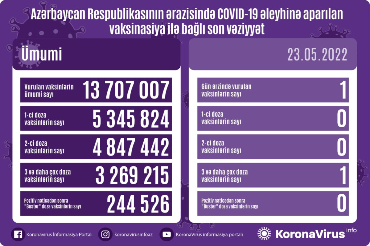 Azərbaycanda son sutkada koronavirus (COVID-19) əleyhinə 1 vaksin vurulub. Bir gündə birinci və ikinci mərhələ üzrə vaksinasiya olunan olmayıb. 3-cü və daha çox doza üzrə vaksinasiya olunanların sayı 1 nəfər təşkil edib. Son sutkada pozitiv nəticədən sonra buster doza olunan da qeydə alınmayıb.