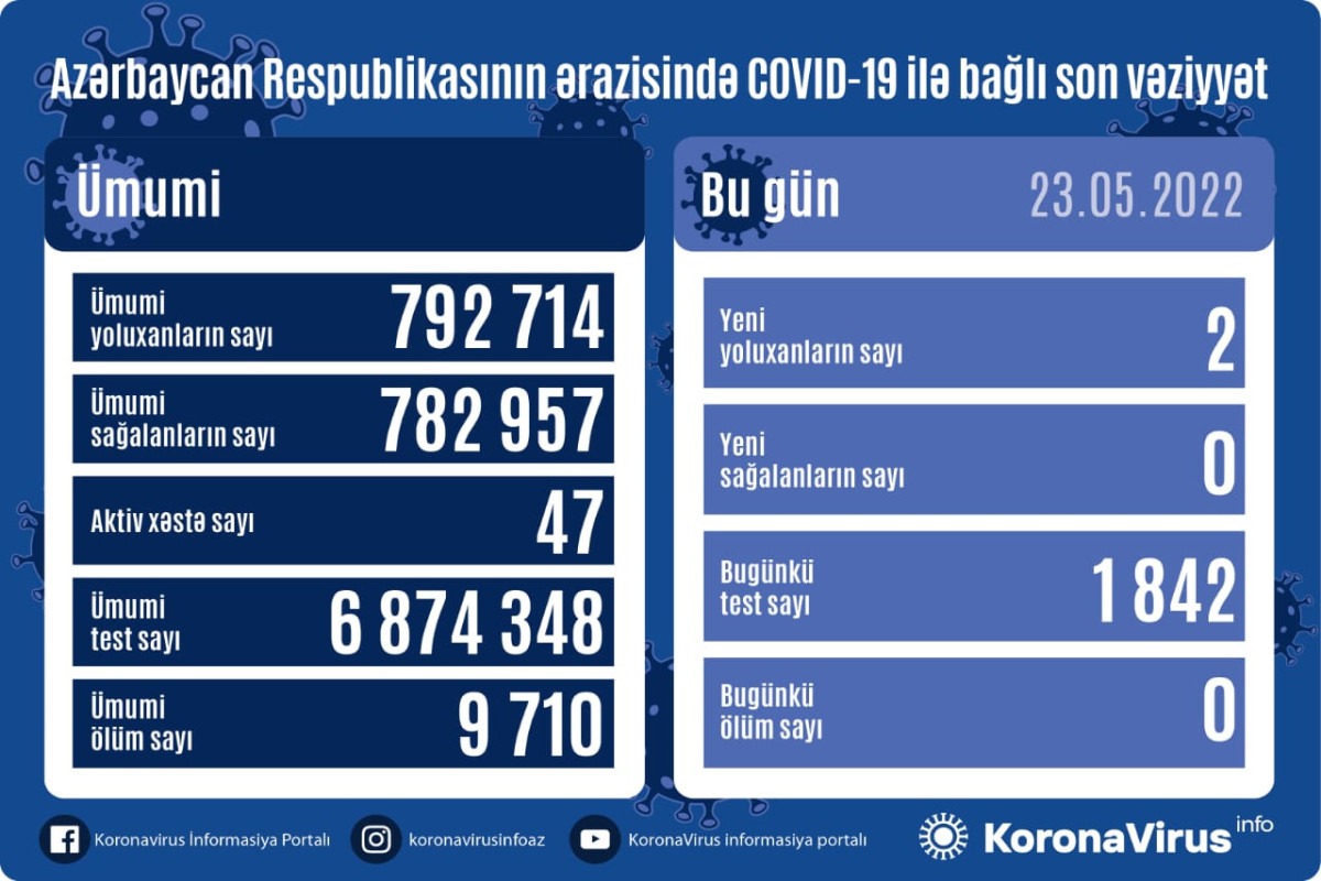 Azərbaycanda koronavirus (COVID-19) infeksiyasına 2 yeni yoluxma faktı qeydə alınıb, müalicə olunamlar arasında sağalan olmayıb.