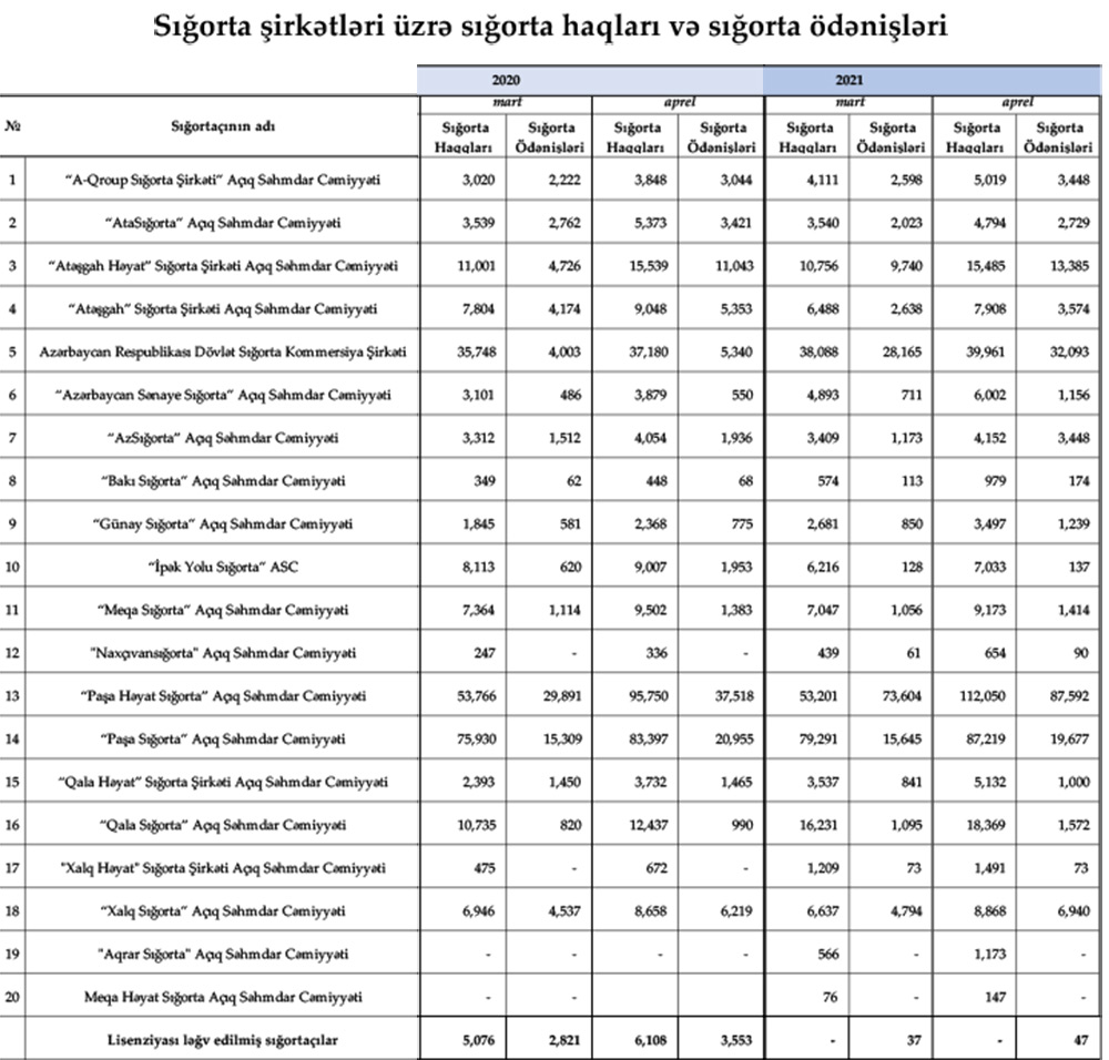 Azərbaycan Mərkəzi Bankının açıqladığı statistikaya əsasən, bu ilin yanvar-aprel aylarında 20 sığorta şirkətindən 14-nün sığorta yığımları artıb, 6-nın yığımları isə azalıb. Bu dövrdə 12 sığorta şirkətinin ödənişləri artıb, 7 sığorta şirkətinin ödənişləri azalıb və 1 sığorta şirkəti isə ödəniş həyata keçirməyib.