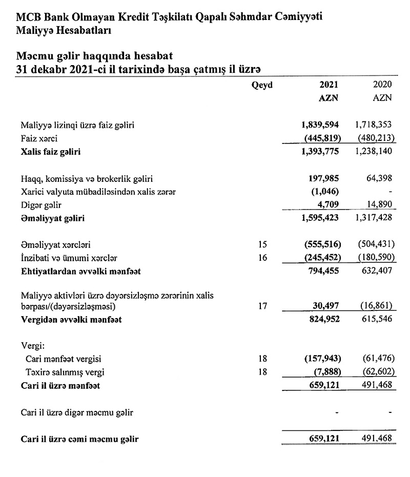 “MCB Bank Olmayan Kredit Təşkilatı” QSC 2021-ci ili 659 min 121 manat xalis mənfəət ilə başa vurub. Halbuki, təşkilat 2020-ci ili 491 min 468 manat xalis mənfəət ilə bağlamışdı. Beləliklə, 2020-ci illə müqayisədə 2021-ci ildə “MCB BOKT”un xalis mənfəəti 34% artıb.