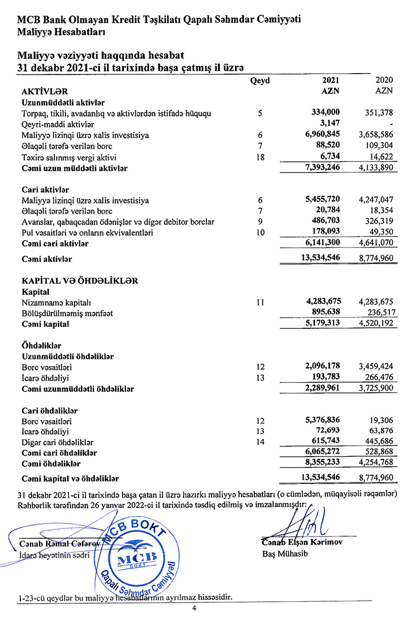 2020-ci illə müqayisədə 2021-ci ildə “MCB BOKT”un portfeli (maliyyə lizinqi üzrə xalis investisiya) 57% artaraq 12 milyon 416 min 565 manata yüksəlib. 2020-ci ilin sonunda şirkətin portfeli 7 milyon 905 min 633 manat təşkil etmişdi.