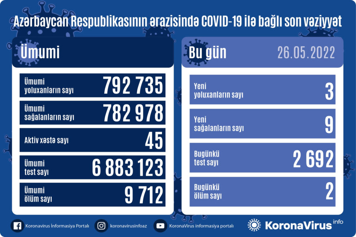 Azərbaycan Respublikasında koronavirus (COVID-19) infeksiyasına 3 yeni yoluxma faktı qeydə alınıb, 9 nəfər müalicə olunaraq sağalıb.