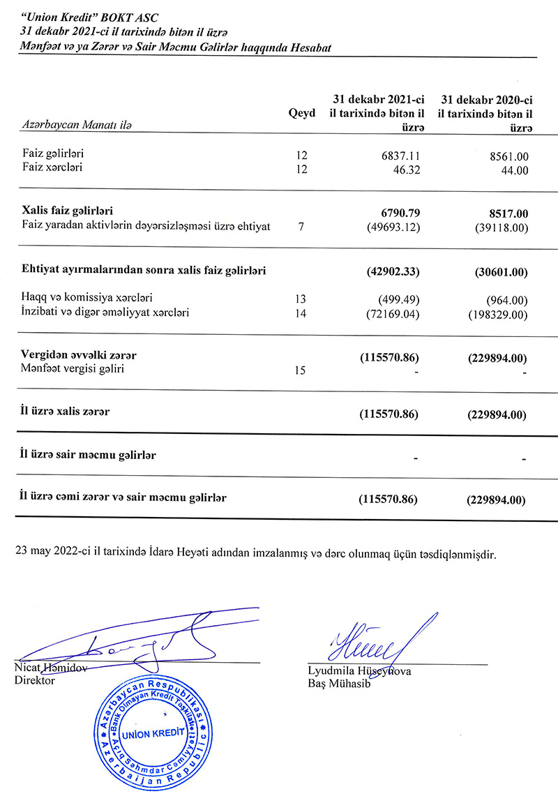 "Union Kredit" BOKT ASC 2021-ci ili 115 min 571 manat xalis zərər ilə başa vurub. Halbuki, təşkilat 2020-ci ili 229 min 894 manat xalis zərər ilə bağlamışdı. Beləliklə, 2020-ci illə müqayisədə 2021-ci ildə "Union Kredit' BOKT-un xalis zərəri 2 dəfə azalıb. Zərərin azalması inzibati və digər əməliyyat xərclərinin azalması ilə əlaqədardır.