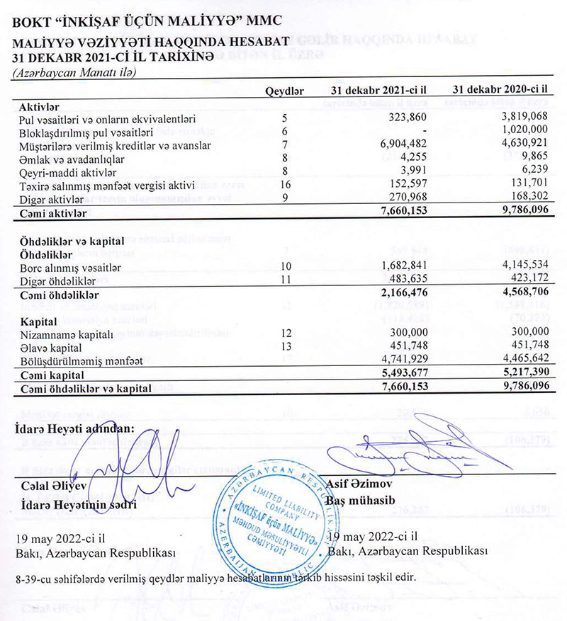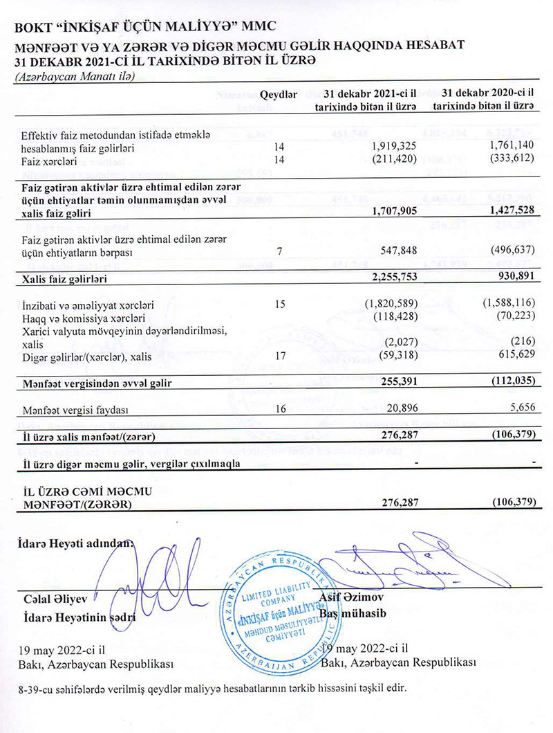 BOKT “İnkişaf Üçün Maliyyə” MMC 2021-ci ili 276 min manat xalis mənfəət ilə başa vurub. Halbuki, təşkilat 2020-ci ili 106 min manat xalis zərər ilə bağlamışdı. Beləliklə, “İnkişaf Üçün Mayyə” zərərdən mənfəətə keçib.
