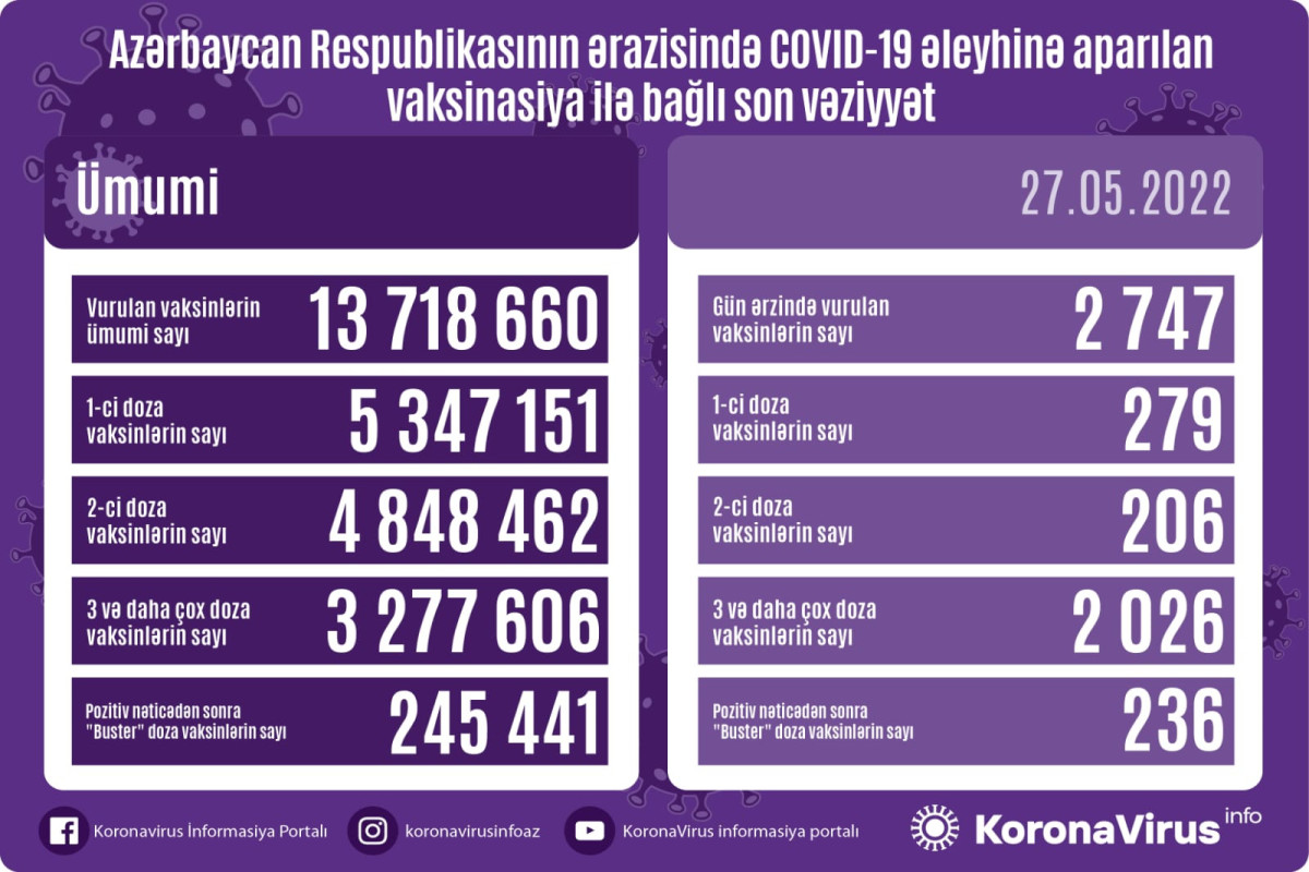 Nazirlər Kabineti yanında Operativ Qərargahdan APA-ya verilən məlumata görə, bir gündə birinci mərhələ üzrə vaksinasiya olunanların sayı 279, ikinci mərhələ üzrə vaksinasiya olunanların sayı 206, 3-cü və daha çox doza üzrə vaksinasiya olunanların sayı 2 026, pozitiv nəticədən sonra buster doza olunanların sayı isə 236 nəfərdir.