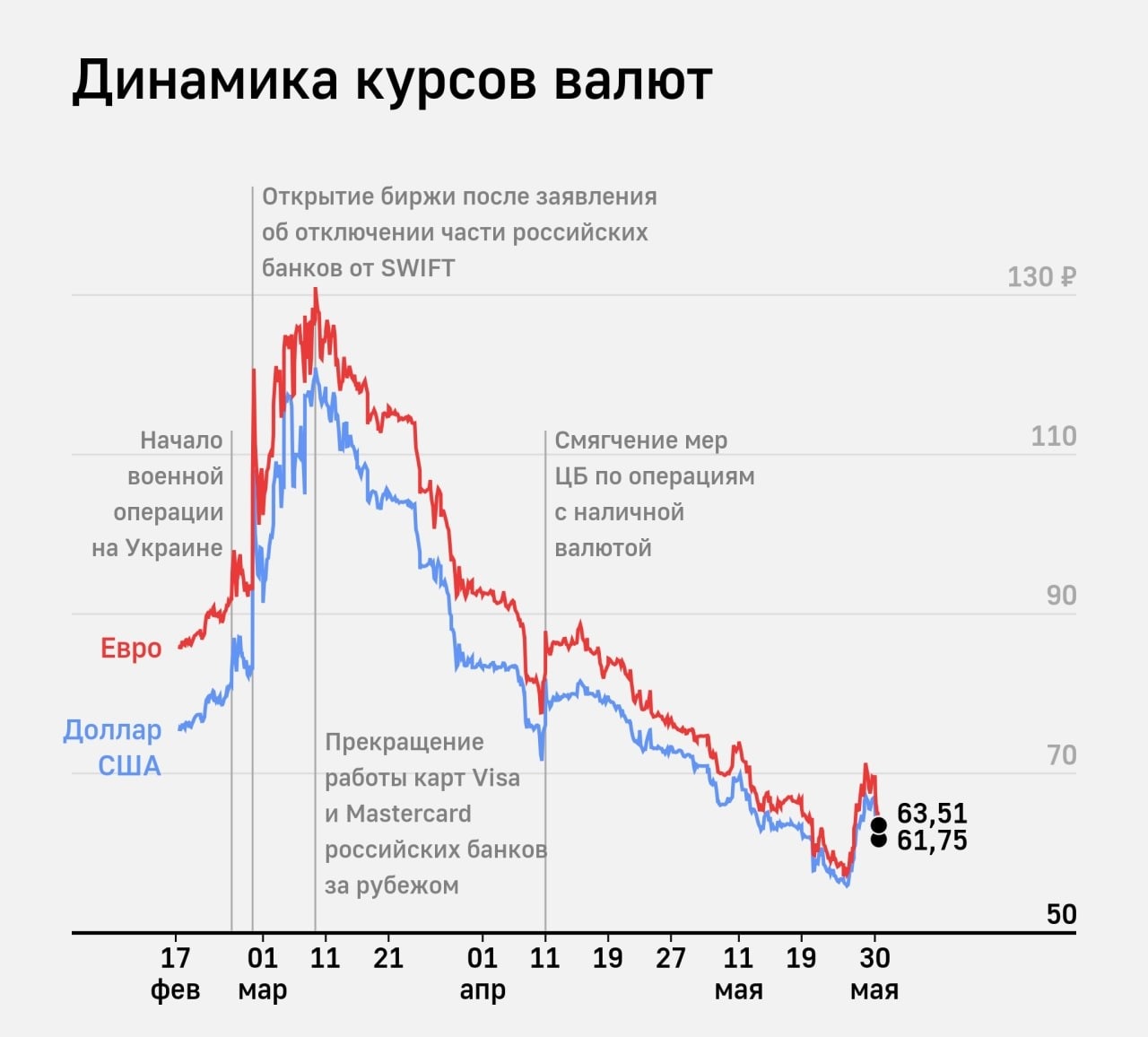 Bakı vaxtı ilə saat 12:05-də dolların məzənnəsi 3,08 rubl ucuzlaşma ilə 63,62 rubl, avro isə 3,94 rubl ucuzlaşma ilə 65,75 rubl təşkil edib.