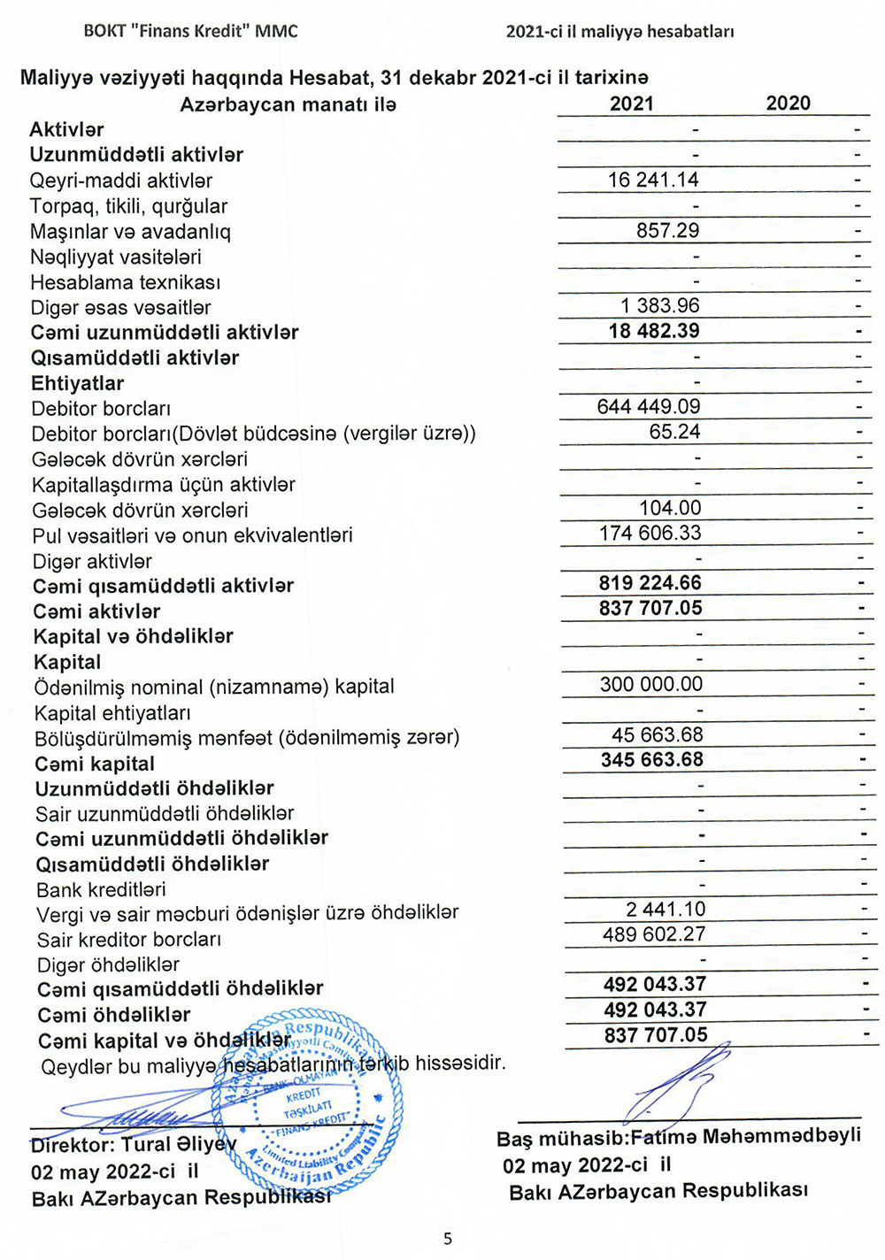 31 Dekabr 2021-ci il tarixində “Finans Kredit” 300 min manat nizamnamə kapitalına malik olub.