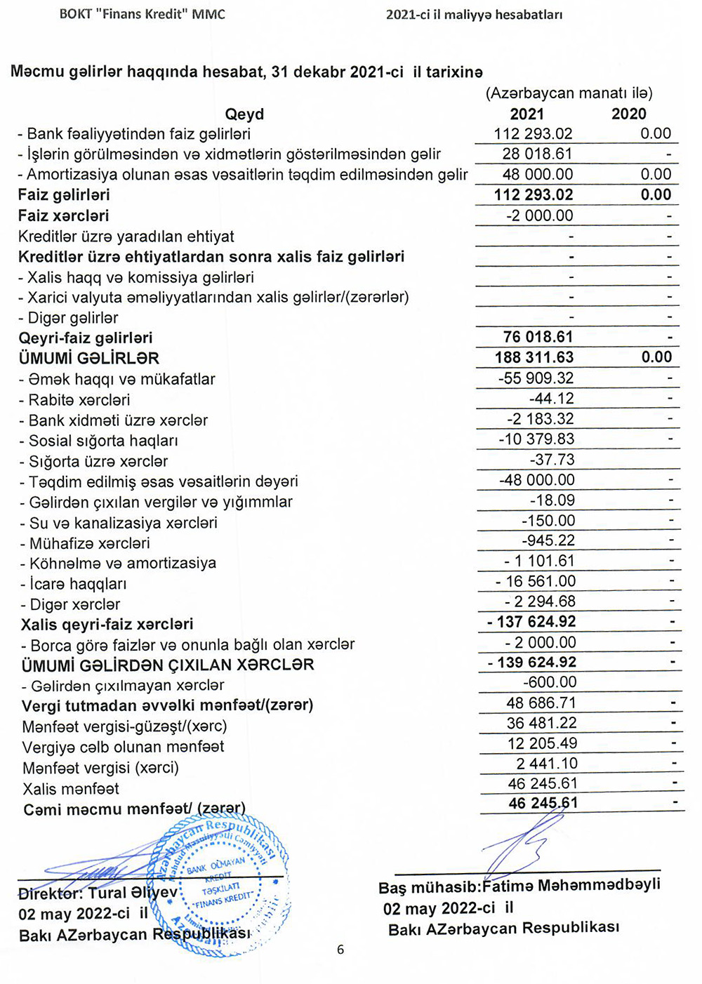 Marja.az Təşkilatın 31 Dekabr 2021-ci il tarixində bitən il üzrə maliyyə hesabatlarına istinadən xəbər verir ki, BOKT “Finans Kredit” ötən ili 46 min 246 manat xalis mənfəət ilə başa vurub.