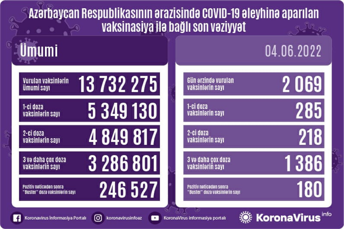 Azərbaycanda son sutkada koronavirus (COVID-19) əleyhinə 2069 vaksin vurulub. Bir gündə birinci mərhələ üzrə vaksinasiya olunanların sayı 285, ikinci mərhələ üzrə vaksinasiya olunanların sayı 218, üç və daha çox doza üzrə vaksinasiya olunanların sayı 1386, pozitiv nəticədən sonra buster doza üzrə vaksinasiya olunanların sayı 180 nəfərdir.