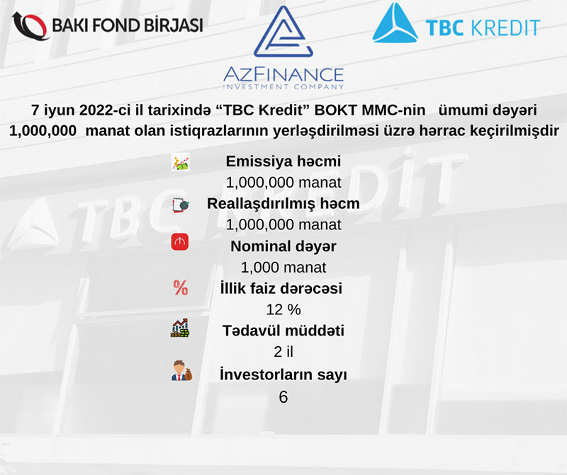 “TBC Kredit” BOKT MMC-nin istiqrazlarının yerləşdirilməsi üzrə hərrac keçirilmişdir7 iyun 2022-ci il tarixində Bakı Fond Birjasında “TBC Kredit” BOKT MMC-nin tədavül müddəti 2 (iki) təqvim ili olan AZ2005019164 dövlət qeydiyyat nömrəli, 1 milyon manat həcmində, faizli, təmin edilməmiş sənədsiz, adlı istiqrazlarının yerləşdirilməsi üzrə hərrac yekunlaşıb.