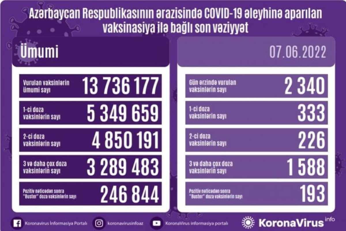 Azərbaycanda son sutkada koronavirus (COVID-19) əleyhinə 2 340 vaksin vurulub. Bir gündə birinci mərhələ üzrə vaksinasiya olunanların sayı 333, ikinci mərhələ üzrə vaksinasiya olunanların sayı 226, üç və daha çox doza üzrə vaksinasiya olunanların sayı 1 588, pozitiv nəticədən sonra buster doza üzrə vaksinasiya olunanların sayı 193 nəfərdir.
