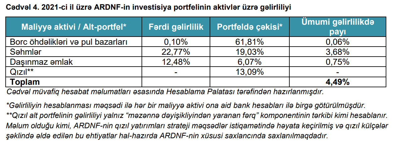 “2020-ci ilə nisbətən gəlirliliyin yuxarı olmasının səbəbi kimi hesabat ilində səhmlər və daşınmaz əmlak alt portfeli üzrə gəlirliliyin yuxarı olması olmuşdur. Tərəfimizdən verilmiş Fondun 2021-ci ilin büdcəsinin layihəsinə Rəydə vəsaitlərin idarə olunması ilə bağlı ilin sonuna müsbət tendensiyanın müşahidə edilməsi və gəlirliliyin daha da artma ehtimalının olması öz əksini tapmışdır. 2021-ci il üzrə ARDNF-in investisiya portfelinin aktivlər üzrə gəlirliliyi aşağıdakı cədvəldə verilmişdir”,- Rəydə deyilir.
