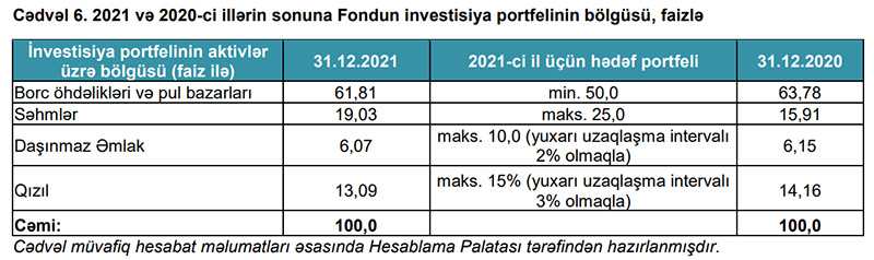 Qeyd edilib ki, Fondun 2021-ci il üzrə qəbul edilmiş İnvestisiya Siyasətinə əsasən investisiya portfelinin minimum 50% borc öhdəlikləri və pul bazarları alətlərindən, 25%-ə qədəri səhmlərdən, 10%-ə qədəri daşınmaz əmlakdan və 15%-ə qədəri isə qızıl alt portfellərindən ibarət olmuşdur.