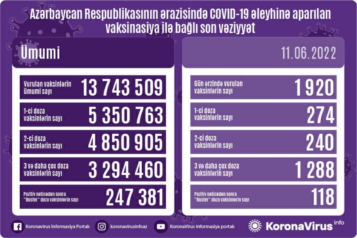 Azərbaycanda son sutkada koronavirus (COVID-19) əleyhinə 1 920 vaksin vurulub. Bir gündə birinci mərhələ üzrə vaksinasiya olunanların sayı 274, ikinci mərhələ üzrə vaksinasiya olunanların sayı 240, üç və daha çox doza üzrə vaksinasiya olunanların sayı 1 288, pozitiv nəticədən sonra buster doza üzrə vaksinasiya olunanların sayı 118 nəfərdir.