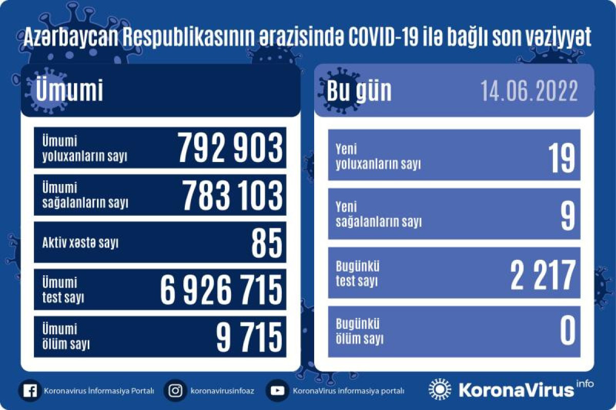 Azərbaycan Respublikasında koronavirus (COVID-19) infeksiyasına 19 yeni yoluxma faktı qeydə alınıb, 9 nəfər müalicə olunaraq sağalıb.