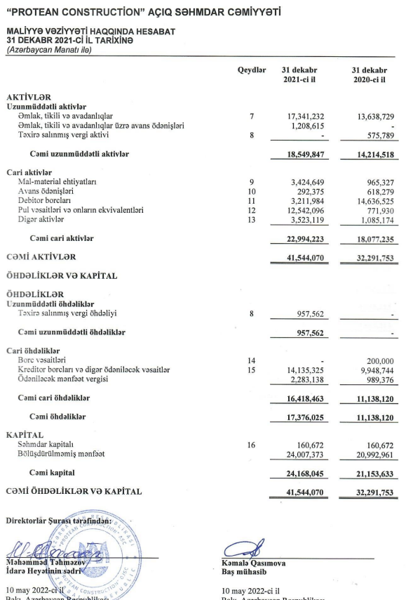 31 Dekabr 2021-ci il tarixində “Protean Construction” ASC 22 milyon 994 min manat cəmi aktivlərə malik olub. Şirkət 2020-ci ilin sonunda 18 milyon 77 min manat cəmi aktivlərə malik idi.