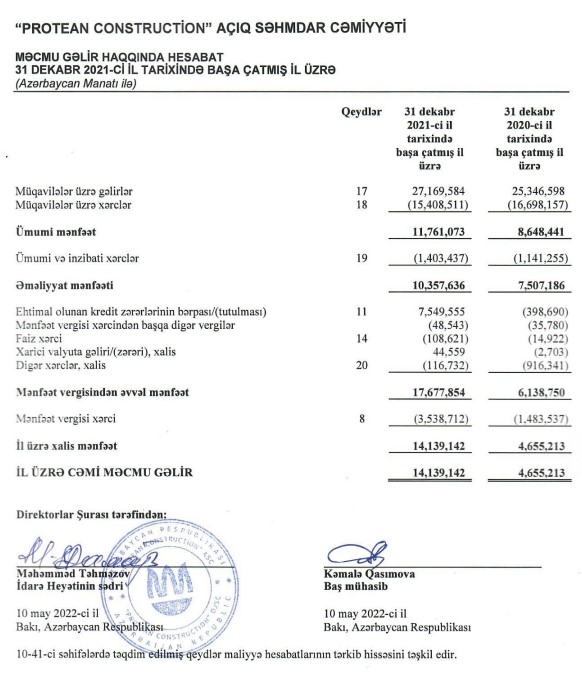 İnşaat sektorunda fəaliyyət göstərən “Protean Construction” ASC 2021-ci ili 14 milyon 139 min manat xalis mənfəət ilə başa vurub. 2020-ci illə müqayisədə 2021-ci ildə şirkətin xalis mənfəəti 3 dəfə artıb. “Protean Construction” ASC 2020-ci ili 4 milyon 655 min manat xalis mənfəət ilə bağlamışdı.