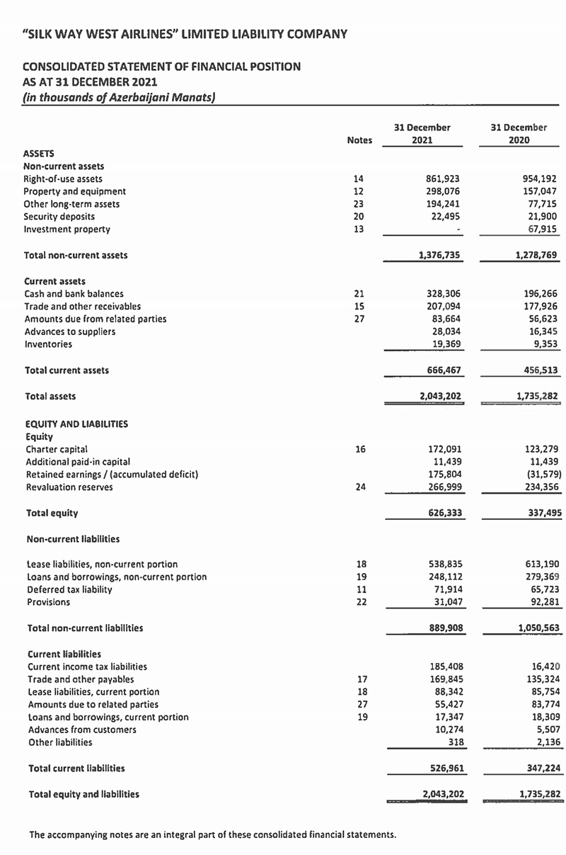 31 dekabr 2021-ci il tarixində "Silk Vey Vest Aviaşirkəti" 2 milyard 43 milyon manat cəmi aktivlərə malik olub. Şirkət 2020-ci ilin sonunda 1 milyard 735 milyon manat cəmi aktivlərə malik idi.