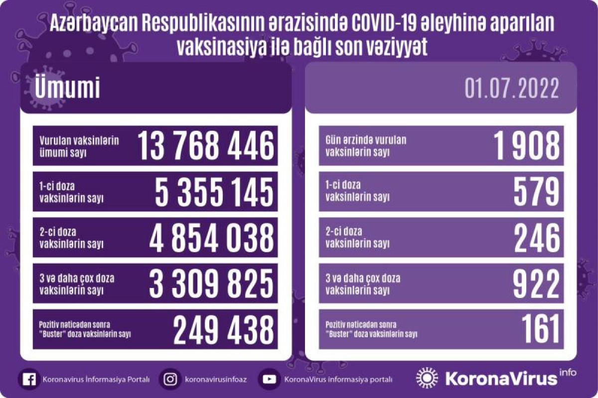 Azərbaycanda son sutkada koronavirus (COVID-19) əleyhinə 1908 vaksin vurulub. Bir gündə birinci mərhələ üzrə vaksinasiya olunanların sayı 579, ikinci mərhələ üzrə vaksinasiya olunanların sayı 246, üç və daha çox doza üzrə vaksinasiya olunanların sayı 922, pozitiv nəticədən sonra buster doza üzrə vaksinasiya olunanların sayı 161 nəfərdir.