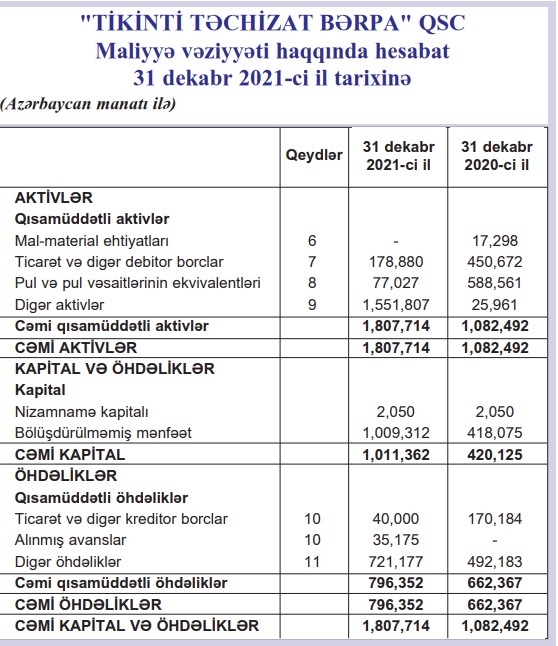 31 Dekabr 2021-ci il tarixində "Tikinti Təchizat Bərpa" QSC 1 milyon 808 min manat cəmi aktivlərə malik olub.