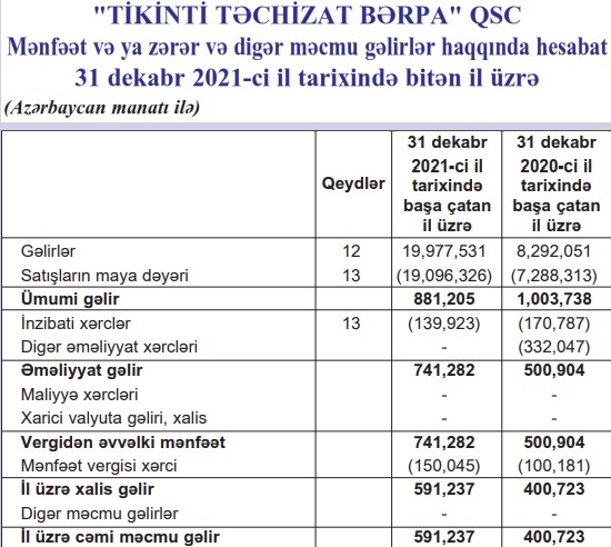 Bakı Şəhər İcra Hakimiyyətinin tenderlərində qalib elan edilən "Tikinti Təchizat Bərpa" QSC 2021-ci ili 591 min manat xalis mənfəət ilə başa vurub. QSC 2020-ci ili 401 min manat xalis mənfəət ilə bağlamışdı.