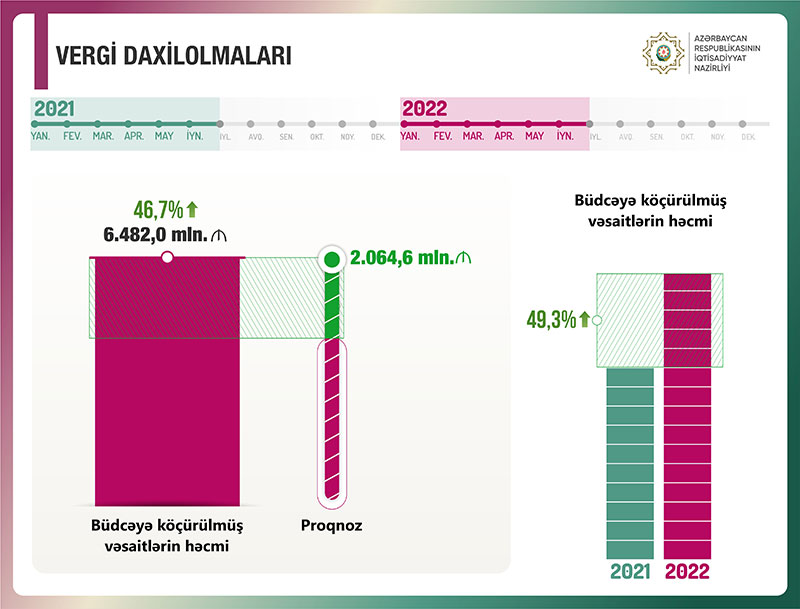 Dövlət Vergi Xidməti 2022-ci il yanvar-iyun ayları üçün nəzərdə tutulan büdcə öhdəliyini 146,7% yerinə yetirib. Dövlət büdcəsinə 6 milyard 482 milyon manat köçürülüb ki, bu da nəzərdə tutulan proqnozdan 2 milyard 64,6 milyon manat artıqdır.