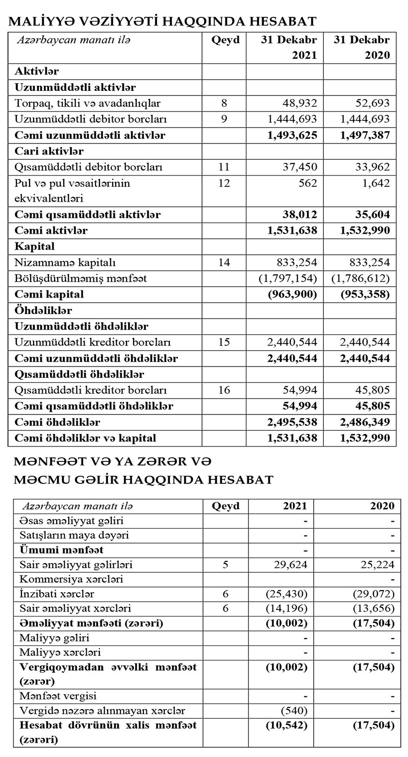 “Azərtəkrarqarametal” ASC 2021-ci ili 10 min 542 manat xalis zərər ilə başa vurub. ASC 2020-ci ili 17 min 504 manat xalis zərər ilə bağlamışdı.