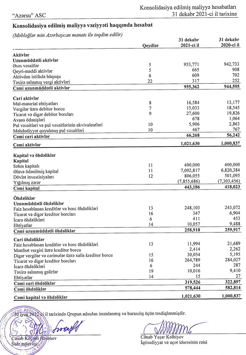Marja.az xəbər verir ki, 31 dekabr 2021-ci il tarixində "Azərsu" ASC-nin yığılmış zərəri 7 milyard 855 milyon 686 min manata çatıb.