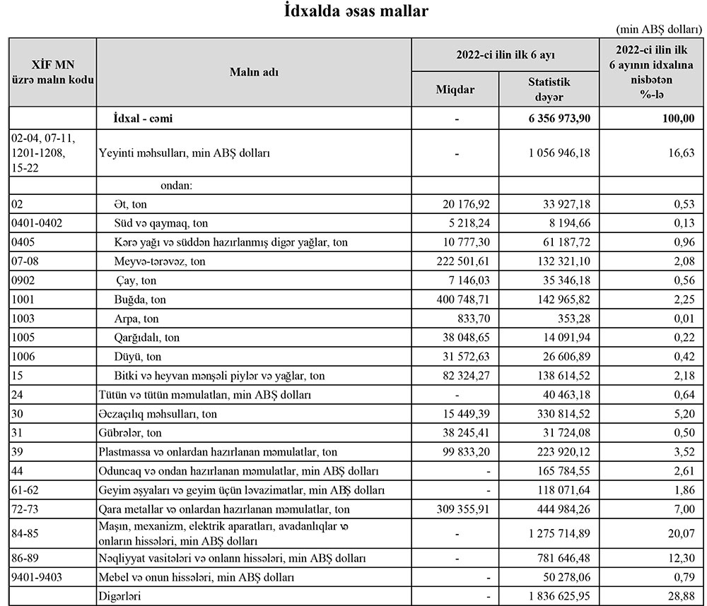 2022-ci ilin yanvar-iyun aylarında (ilk 6 ayda) Azərbaycanın ən çox ixrac və idxal etdiyi mallar açıqlanıb.