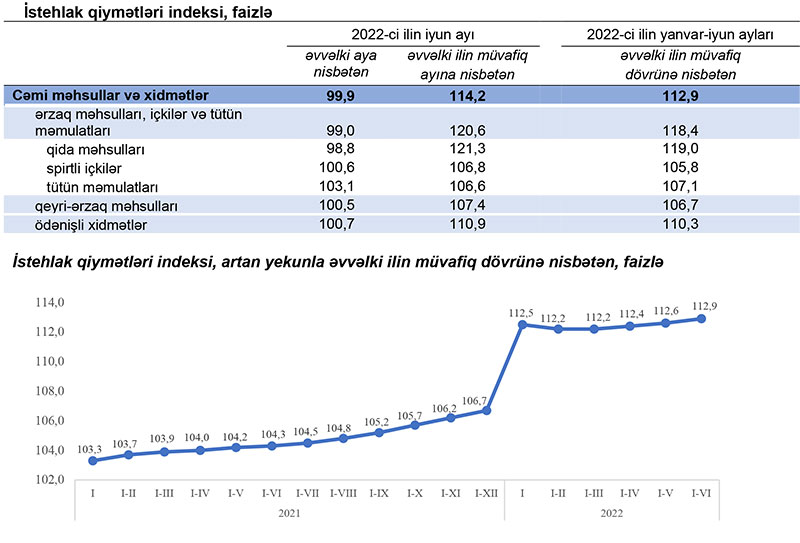 2022-ci ilin yanvar-iyun aylarında istehlak qiymətləri indeksi (inflyasiya göstəricisi) 2021-ci ilin yanvar-iyun aylarına nisbətən 12,9 faiz, o cümlədən ərzaq məhsulları, içkilər və tütün məmulatları üzrə 18,4 faiz, qeyri-ərzaq məhsulları üzrə 6,7 faiz, əhaliyə göstərilmiş ödənişli xidmətlər üzrə 10,3 faiz artıb.