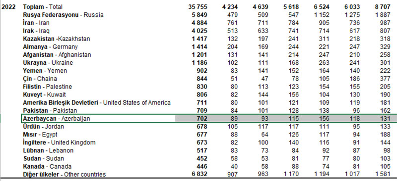 Azərbaycanlılar Türkiyədə 2020-ci ildə 1279 mənzilə, 2021-ci ildə isə 1517 mənzilə mənzilə sahib olublar.