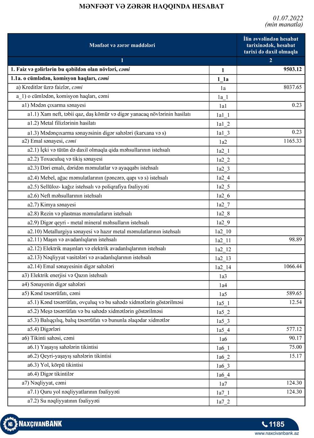 "Naxçıvanbank" ASC 2022-ci ilin birinci yarısını (yanvar-iyun dövrünü) 7 milyon 814 min manat xalis mənfəət ilə başa vurub. Bank ötən ilin eyni dövrünü 3 milyon 684 min manat xalis mənfəət ilə bağlamışdı. Beləliklə, 2021-ci ilin birinci yarısı ilə müqayisədə 2022-ci ilin birinci yarısında "Naxçıvanbank"ın xalis mənfəəti 2,1 dəfə artıb. Xalis mənfəətin artması gəlirlərin artmasından qaynaqlanır.