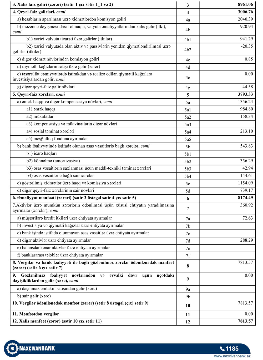 Qeyd edək ki, 2021-ci ilin birinci yarısında "Naxçıvanbank"ın cəmi əməliyyat gəlirləri 8 milyon 585 min manat, cəmi əməliyyat xərcləri 3 milyon 71 min manat, gəlirlər xərcləri üstələdiyindən əməliyyat mənfəəti 5 milyon 514 min manat təşkil etmişdi. Bank əməliyyat mənfəətindən aktivlər üzrə mümkün zərərlərin ödənilməsi üçün xüsusi ehtiyatın yaradılmasına 869 min manat ayırmış, 960 min manat mənfəət vergisi ödəmiş və həmin dövrü 3 milyon 684 min manat xalis mənfəət ilə bağlamışdı.
