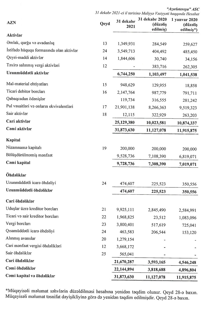 31 Dekabr 2021-ci il tarixində “Azərlotoreya” ASC 31 milyon 874 min manat cəmi aktivlərə malik olub. Şirkət 2020-ci ilin sonunda 11 milyon 127 min manat cəmi aktivlərə malik idi.