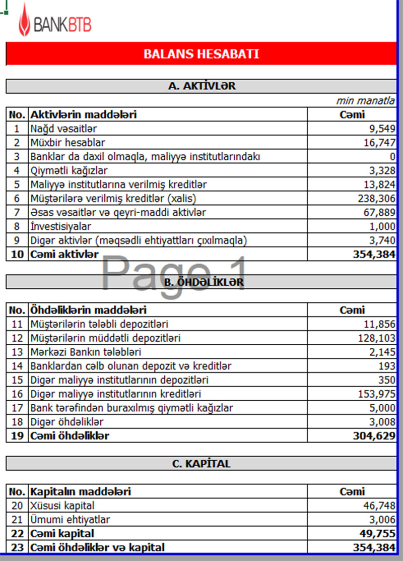 Qeyd edək ki, 2021-ci ilin birinci yarısında Bank BTB-nin cəmi əməliyyat gəlirləri 15 milyon 85 min manat, cəmi əməliyyat xərcləri 14 milyon 977 min manat, əməliyyat mənfəəti 108 min manat təşkil etmişdi. Ehtiyatdan azad olmuş 430 min manat hesabına mənfəət 538 min manata yüksəlmişdi.