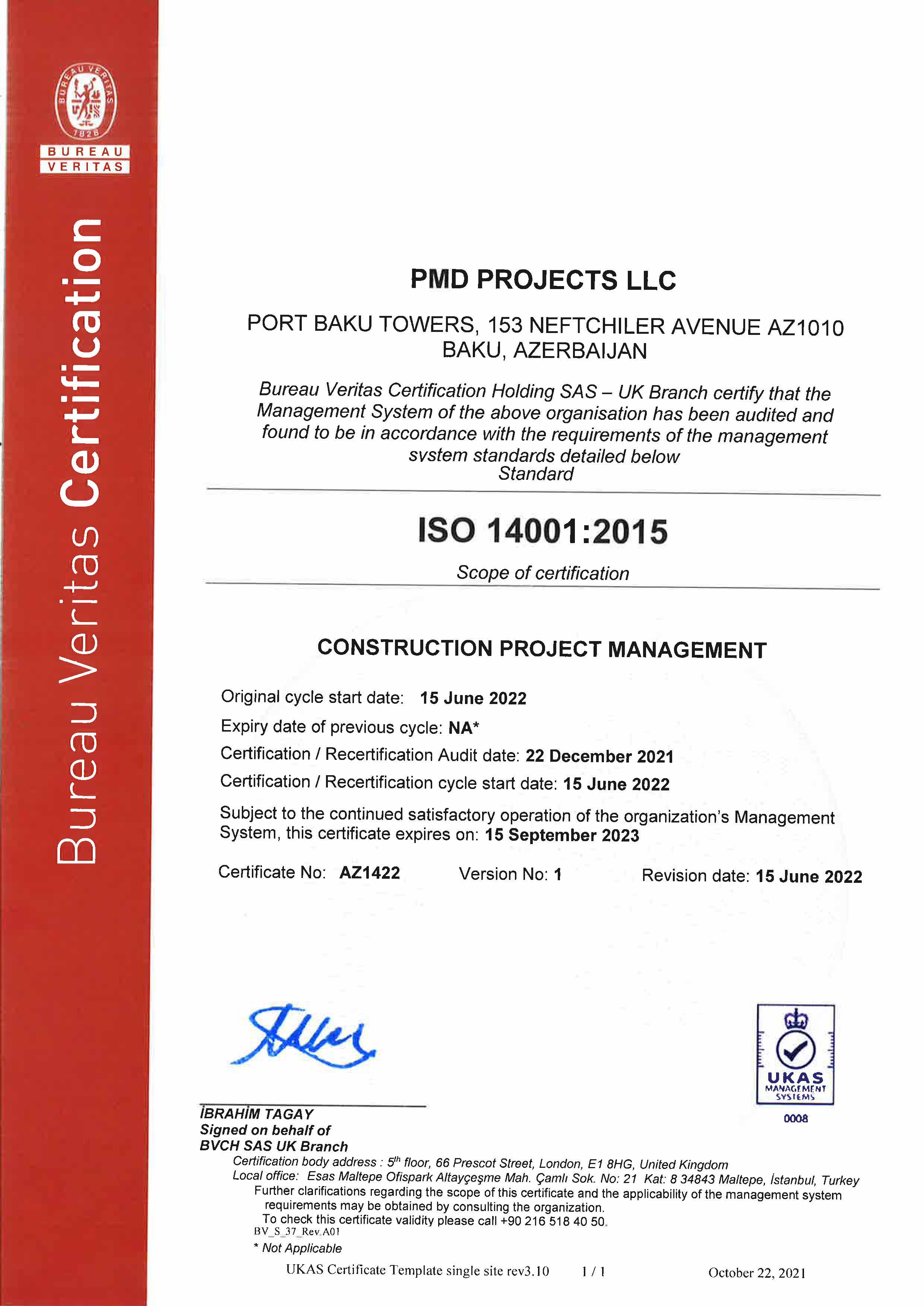 Şirkətin həyata keçirdiyi layihələr çərçivəsində ciddi şəkildə tətbiq edilən sağlamlıq, təhlükəsizlik və ətraf mühit protokollarının beynəlxalq miqyasda tanınması, davamlı təkmilləşməyə sadiqliyin və peşəkar komandanın göstərdiyi böyük səyin nəticəsidir. Bu sertifikatların alınması “PMD Projects” MMC-nin fəaliyyətlərində son dərəcə əhəmiyyətli nailiyyət hesab olunaraq, peşəkar xidmətlər təqdim etmək öhdəliyini nümayiş etdirir.
