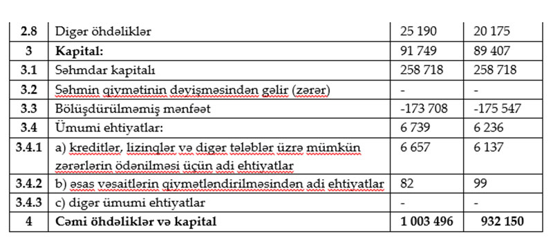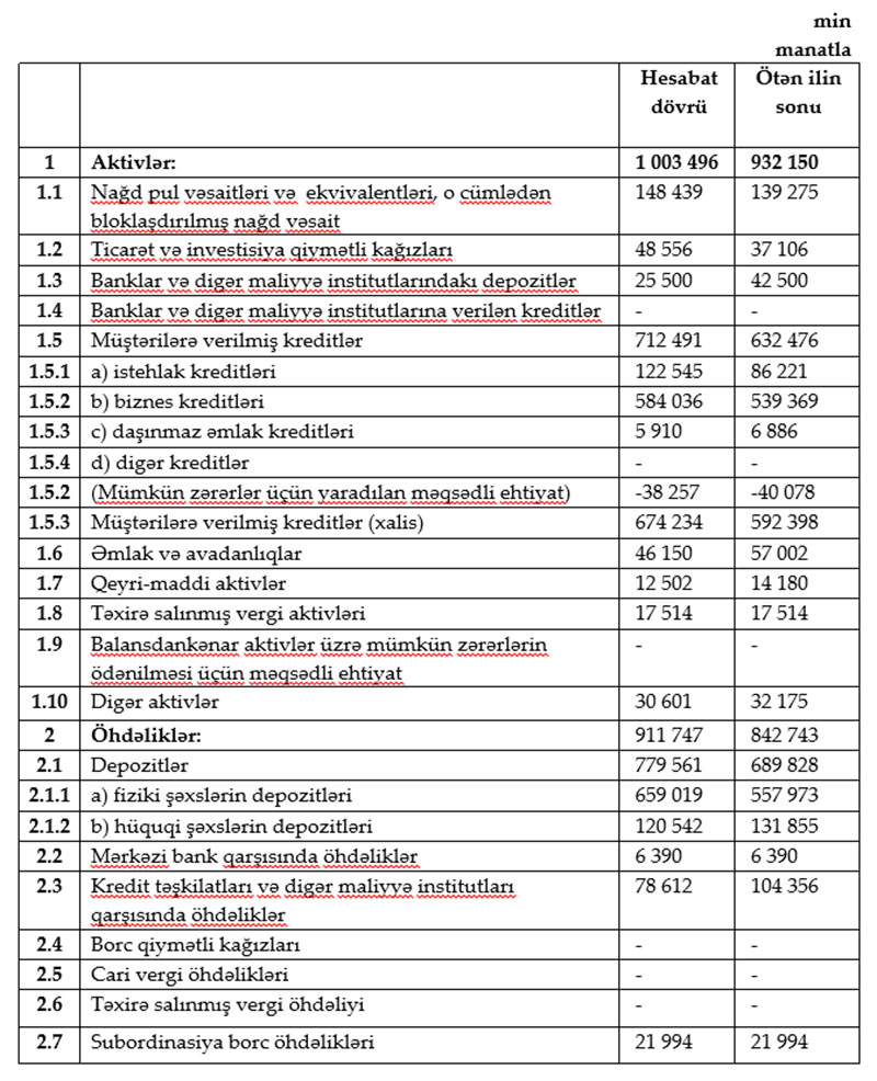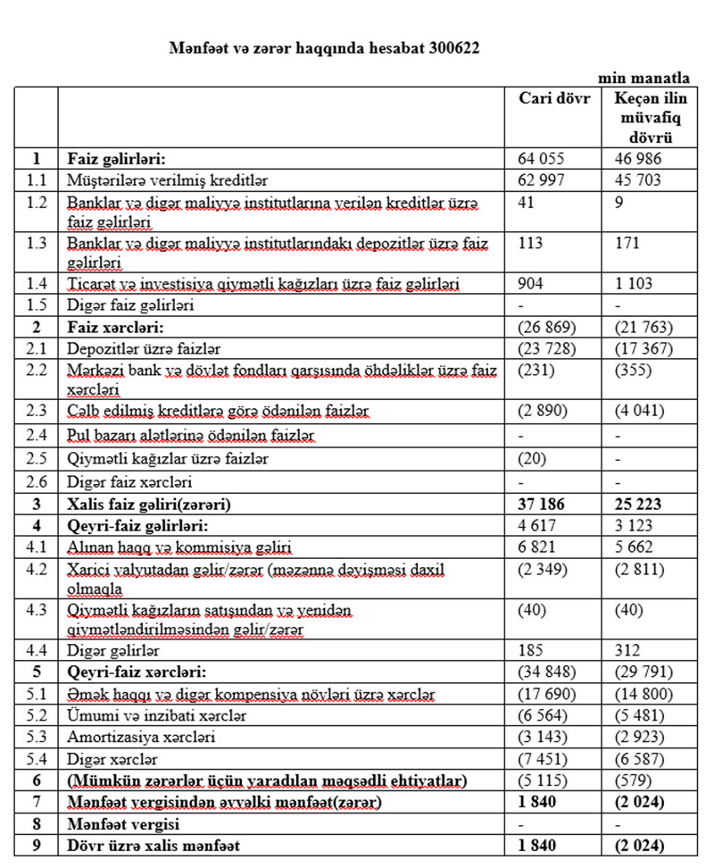 2022-ci ilin ikinci rübündə bankın xalis mənfəəti 1 milyon 37 min manat, yarımillik üzrə 1 milyon 840 min manat təşkil edib.